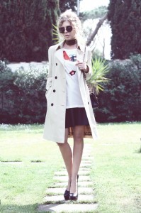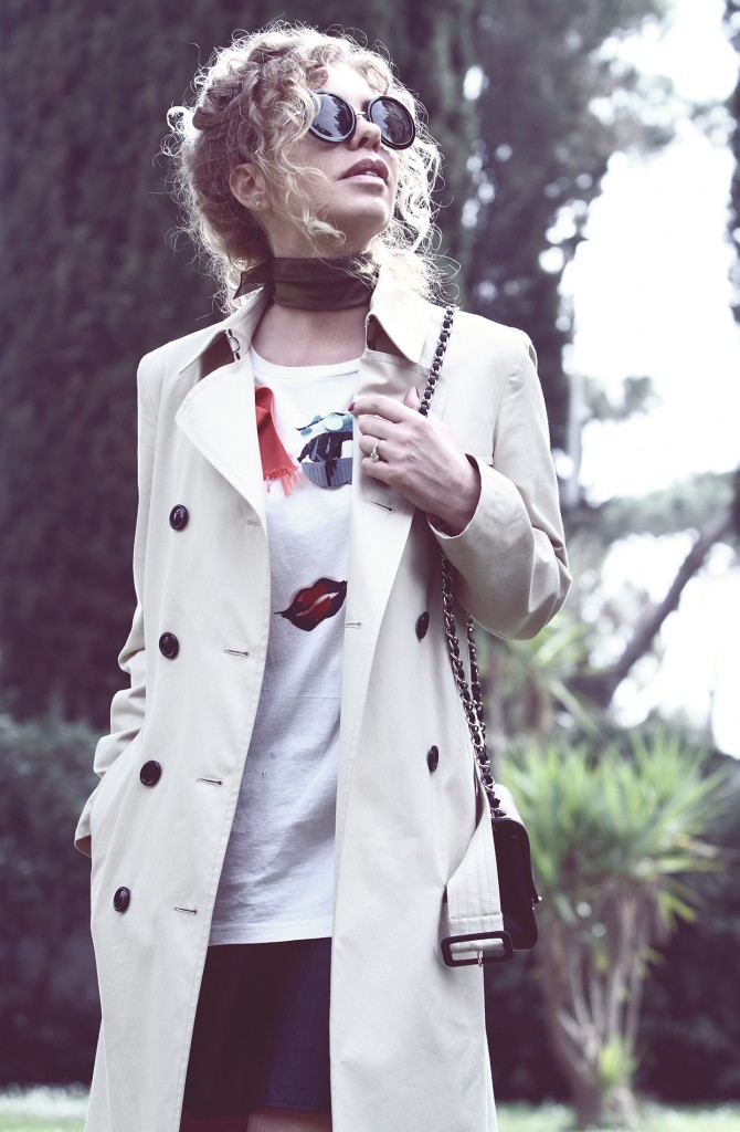 Non è un capo da indossare solo con la pioggia, si può usare anche come cappottino leggero appena il clima ce lo consente. Sta bene a tutte, sulle curvy si adatta con leggerezza, alle magre cade a pennello. Oggi ho voluto interpretarlo in versione femminile , un pò romantico, pettinatura compresa, ma con un tocco di colore dato dalla maglietta devo dire molto divertente. Andiamo a vedere…..