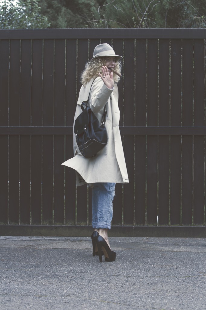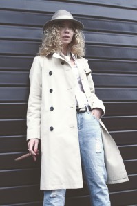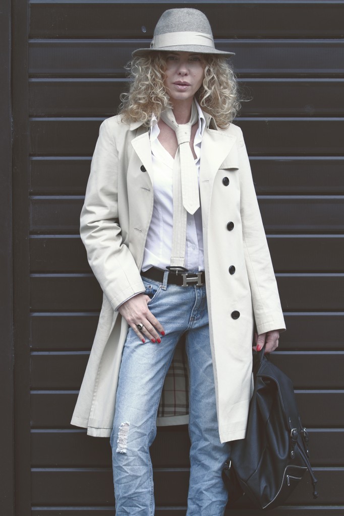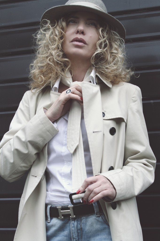 Viste le previsioni del tempo il trench mi sembra l’argomento adatto da trattare in questo weekend. Questa volta l’ho interpretato scherzando un pò e calcando la mano sull’aspetto maschile di questo capo che in realtà è assolutamente unisex. Togliendo i tacchi, la cravatta/cinta e mettendo un paio di calosce con i  jeans e un bel cappello trovo che sia un outfit comodo e raffinato.