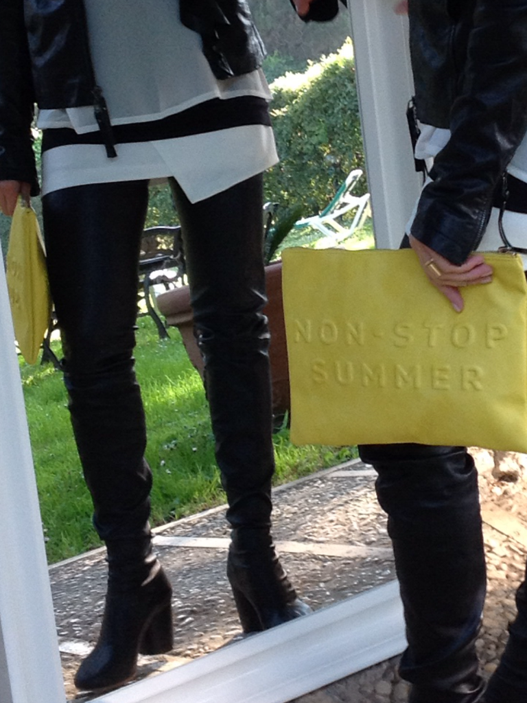 Uscendo in giardino mi sono posta la famosa frase di rito di questo periodo: come mi vesto?  Non sapendo scegliere se optare per un look completamente primaverile, a dei tessuti e dei colori quasi estivi ho accostato il mio amato giubbotto di pelle nera invernale (per poi toglierlo appena entrata in macchina, temperatura 24 gradi!), e i miei meravigliosi stivali Maison Martin Margiela, regalo della mia insostituibile amica Margherita, (lei ha delle gambe chilometriche!).