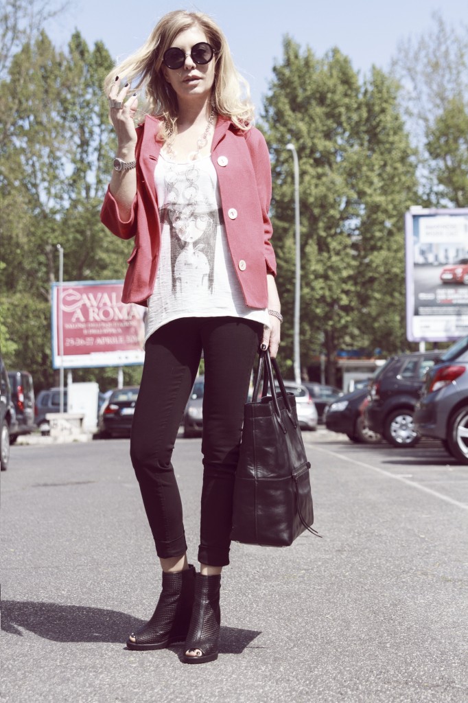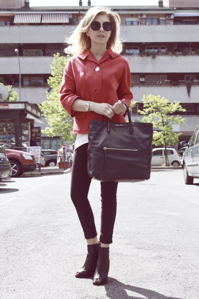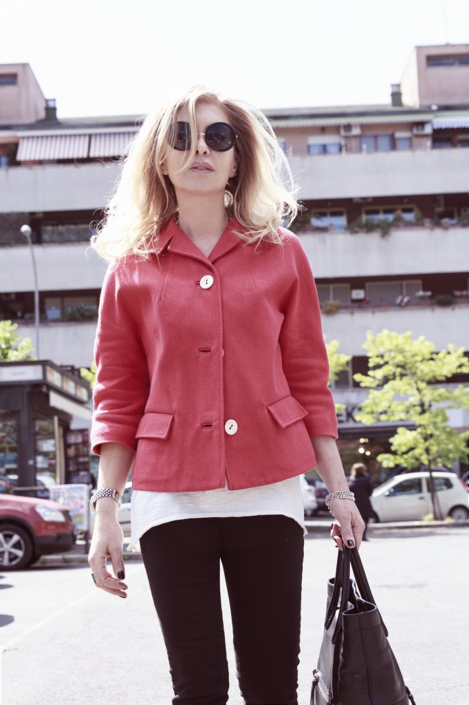 In questo servizio indosso una classica giacchina rossa, dalla linea ampia,  dettaglio che la rende assolutamente adatta a tutte le silhouette. Io la propongo con degli skinny pants, ma se il problema è qualche chilo in più, al posto dei pantaloni via libera ad una gonna, anche lunga dalla linea dritta. Unica directive da rispettare: se sopra i volumi sono generosi sotto rimanete slim. Anche questo outfit l’ho creato nella boutique Alessendra, via  Valsavaranche 1, Roma, dove potete trovare la giacca, la canotta ed i pantaloni indossati nel servizio.
