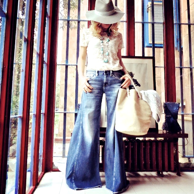 Non c’è nient’altro di così fuori dagli schemi, ed allo stesso tempo di così adattabile di un paio di jeans. Stanno bene a tutti, e stanno bene con tutto. Li puoi interpretare all’infinito, puoi creare dei looks molto precisi, o indossarli come capita, il risultato è sempre lo stesso : supertrendy!!  Con questo modello a zampa ho creato un look un po’ hippy , un po’ nomade, un po’ city. Insomma è chiaro che ho le idee confuse, ma come mi sento bene vestita così.