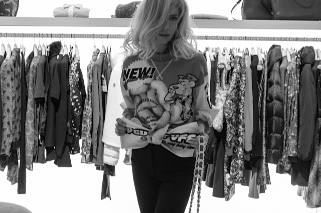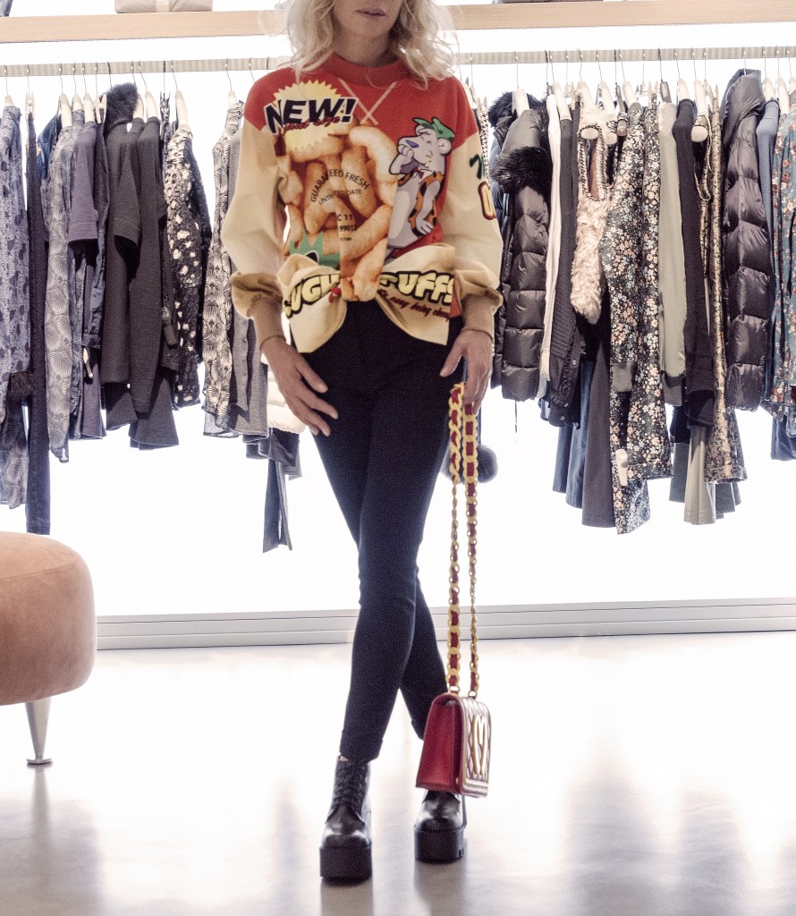 L’urban style attinge sempre di più  alla cartoon mania. I fumetti sono al centro delle idee creative di molti stilisti, e Jeremy Scott per Moschino è l’emblema della tendenza. In questo look non poteva mancare la borsa mc Donald’s a tracolla, è tra le più richieste! L’ironia è la vera protagonista di questo outfit.  Troverete tanto della collezione Moschino da Gibot, via Nomentana 457/473, Roma.