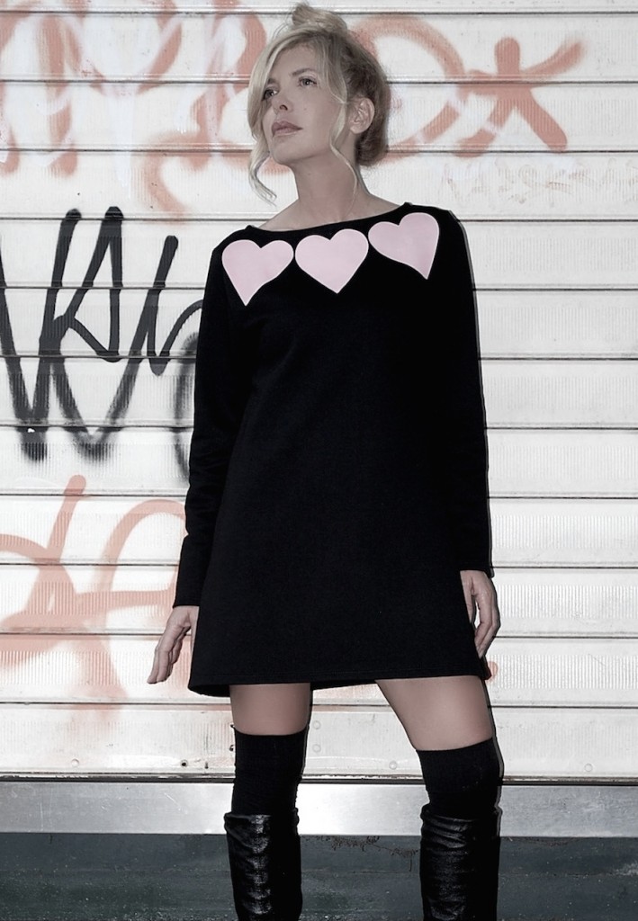 La sfumatura di rosa molto discreta dei cuori interrompe il rigore del vestitino nero, uno dei capi sempre presenti nel nostro guardaroba.