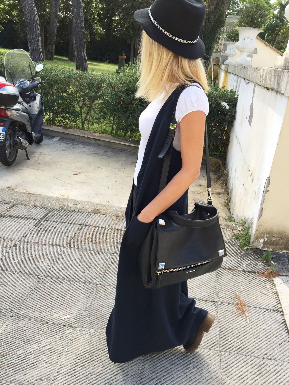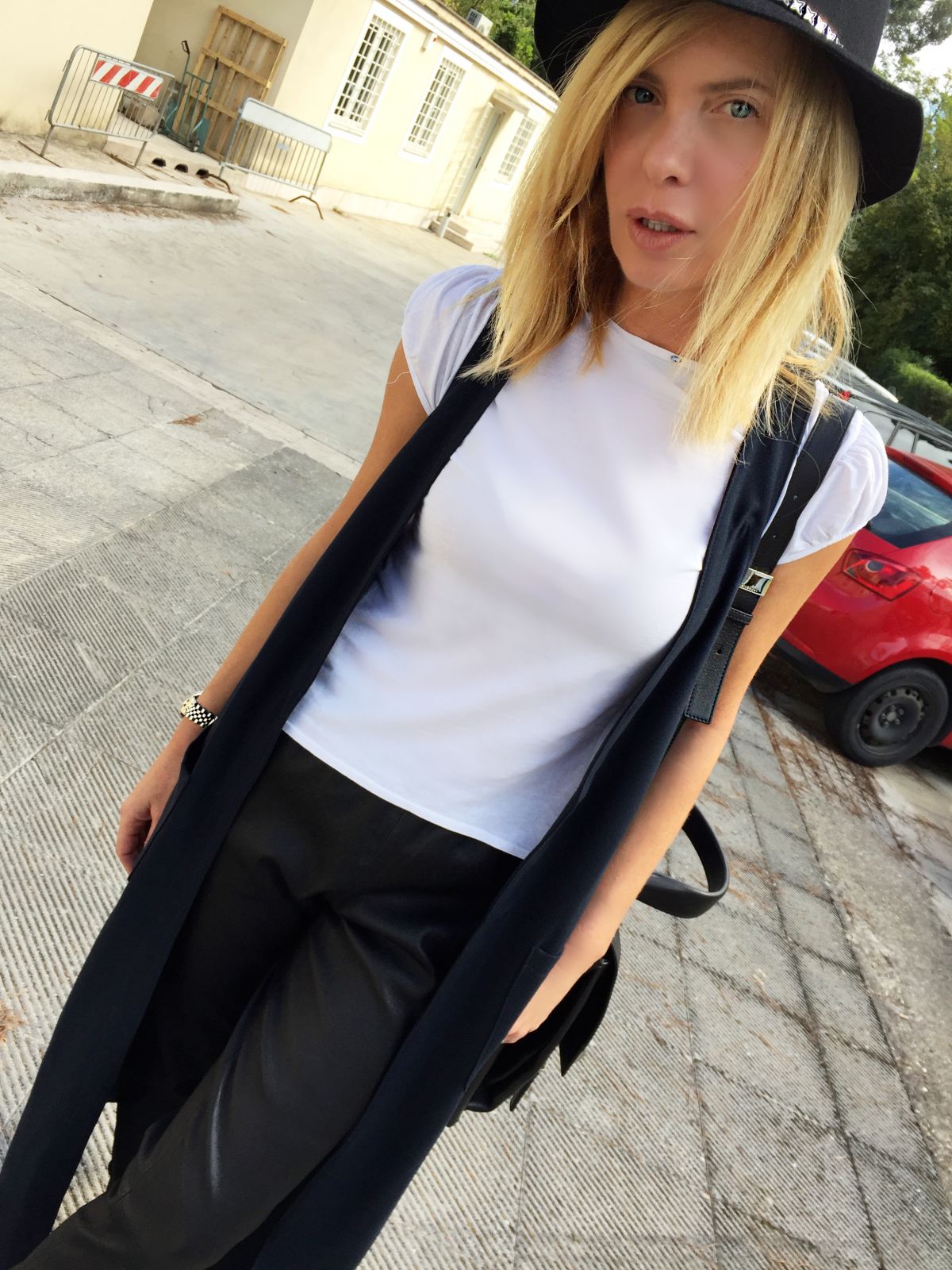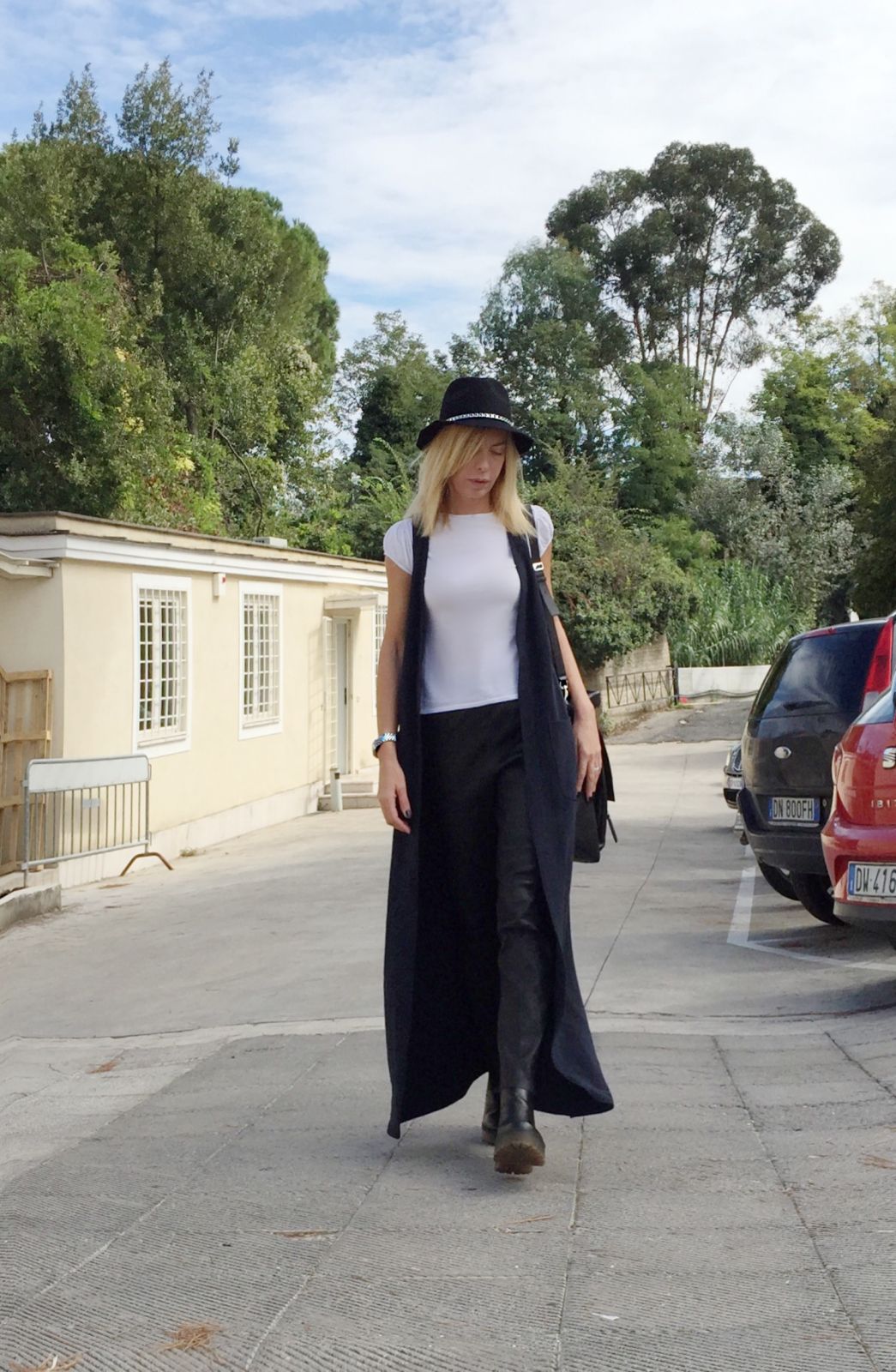 Un gilet lungo, una t-shirt bianca, e un paio di pantaloni in pelle nera, ai piedi dei comodi boots, una borsa capiente e come spesso sottolineo, il mio accessorio preferito: IL CAPPELLO.