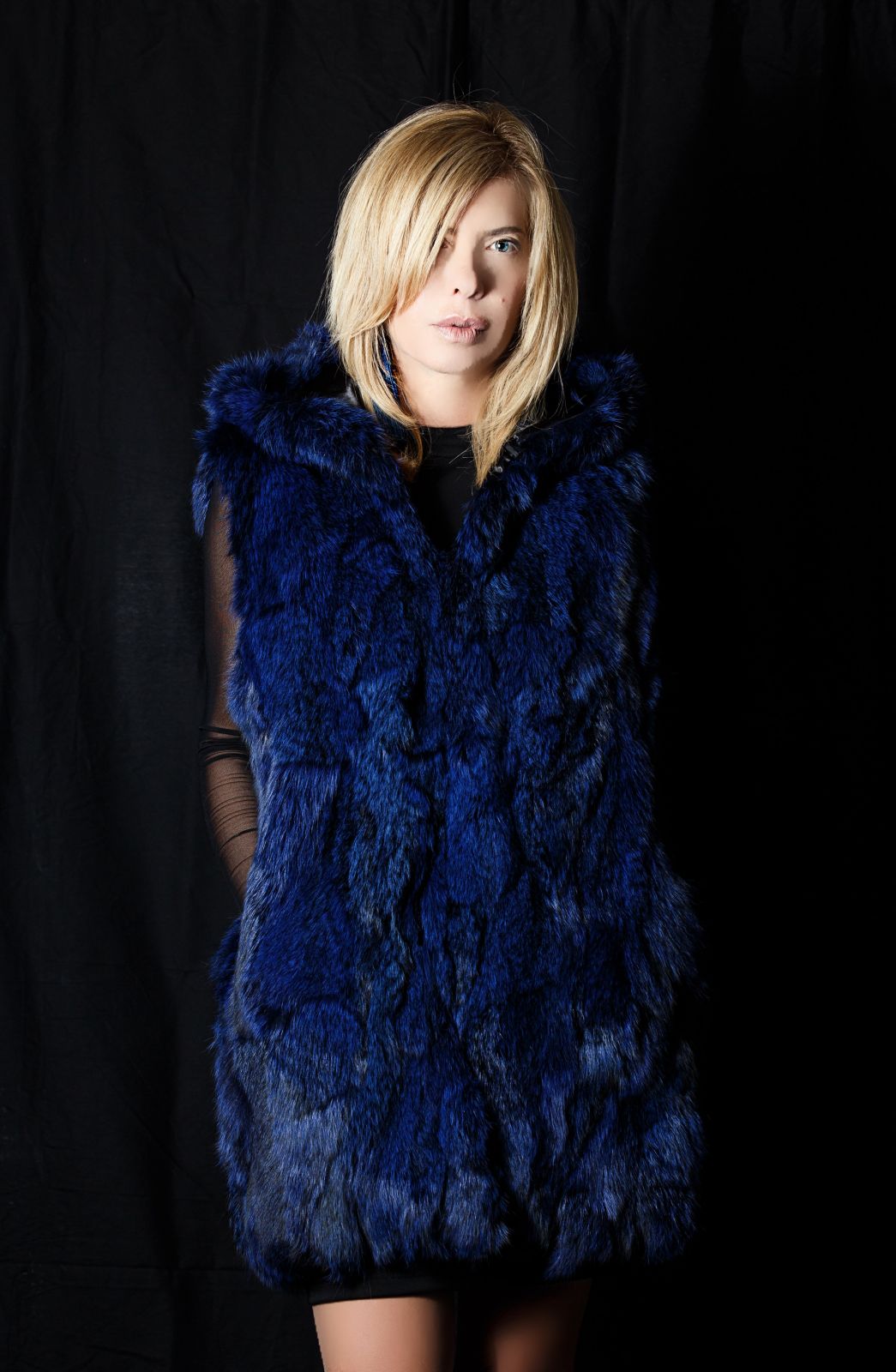 Ci sono piaciute così tanto le maniche dell’abito che non vogliamo coprirle, giusto???  All’unanimità sono certa che la nostra scelta ricadrebbe su questa nuvola blu, una  calda, morbida e avvolgente pelliccia ecologica a gilet lungo, con il cappuccio  che incornicia il viso. Very glamour!!!