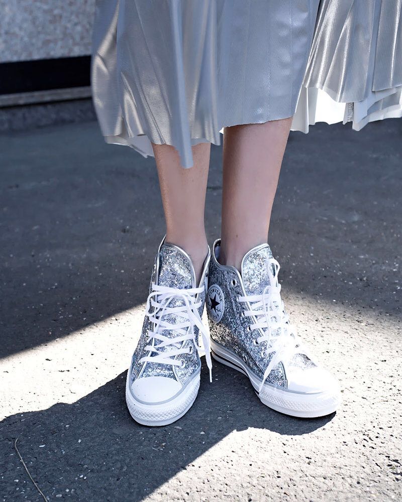 Ecco la mia, leggera, fluttuante e scintillante, abbinata alla camicia dai volumi ampi e ai piedi le amate Converse, indispensabili per me che vado sempre di corsa e sono sempre in ritardo!!!
