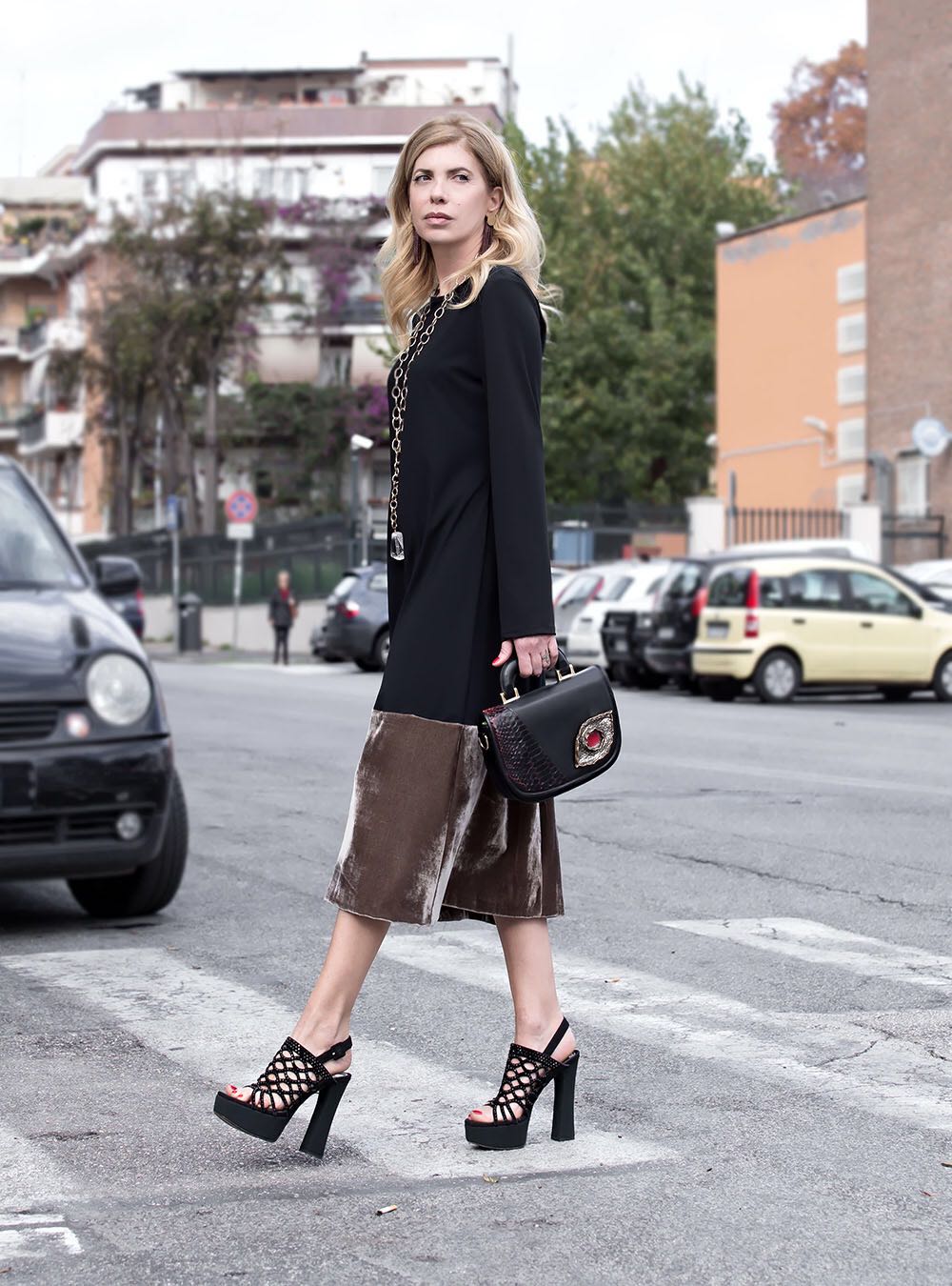 Iniziamo con un abito raffinato al punto giusto, arricchito da una fascia di velluto color oro, senza dimenticare gli accessori: i gioielli scultura di  Patrizia Santamaria, i gioielli in cristallo di Rocca di Francesca Romana Gentili e la borsa, la famosa Alex di Federica Berardelli, tutto da Sensounico Concept Store, via della Farnesina 13a, Roma, un luogo dove incontrare le tre simpatiche, talentuose e belle stiliste. Siamo pronte con un look da party per lasciare tutti a bocca aperta.