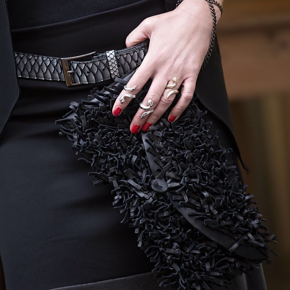 La differenza la fanno sicuramente i dettagli, come al solito, bracciali, anelli, una borsa in pelle morbida e glamour e gli stivaletti lucidi, stile Mary Poppins, con i lacci in velluto.