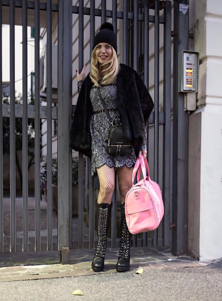 Per il mio outfit di oggi, tra quelle che possiedo ho scelto questa pelliccia ecologica dalla silhouette over, un bel paio di calze a rete, lo so fa freddo ma io le uso anche a -4 gradi, un abito caldo e femminile, da indossare anche con un maglioncino sotto, magari a collo alto e nero, un cappello di lana, un accessorio che non manca quasi mai nei miei look e ai piedi degli irresistibili, caldi e comodi stivali.