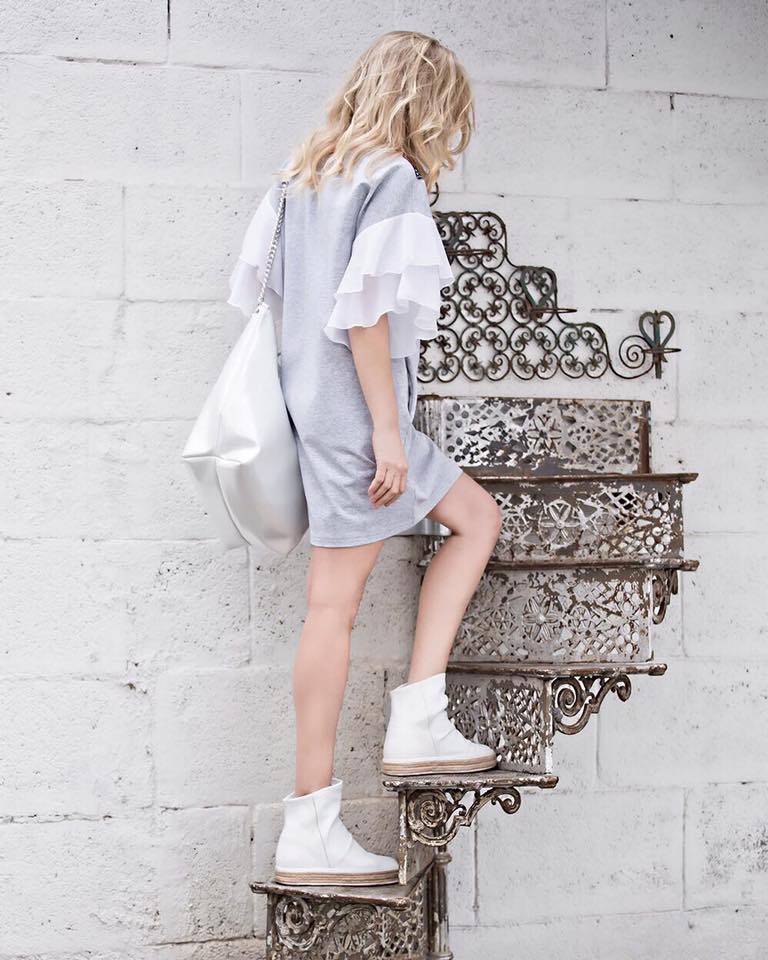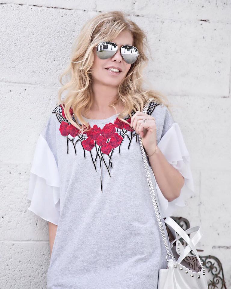 Abito felpa. Per un look pratico e sportivo, ecco l’abito felpa di Paola T. che ci regala un outfit casual ma senza perdere d’occhio l’aspetto fashion. Io l’ho indossato così, ma è giustissimo anche abbinato a un paio di pantaloni o a una gonna lunga, per chi non ama scoprire le gambe e con queste applicazioni floreali è perfetto anche per le fashioniste più romantiche!