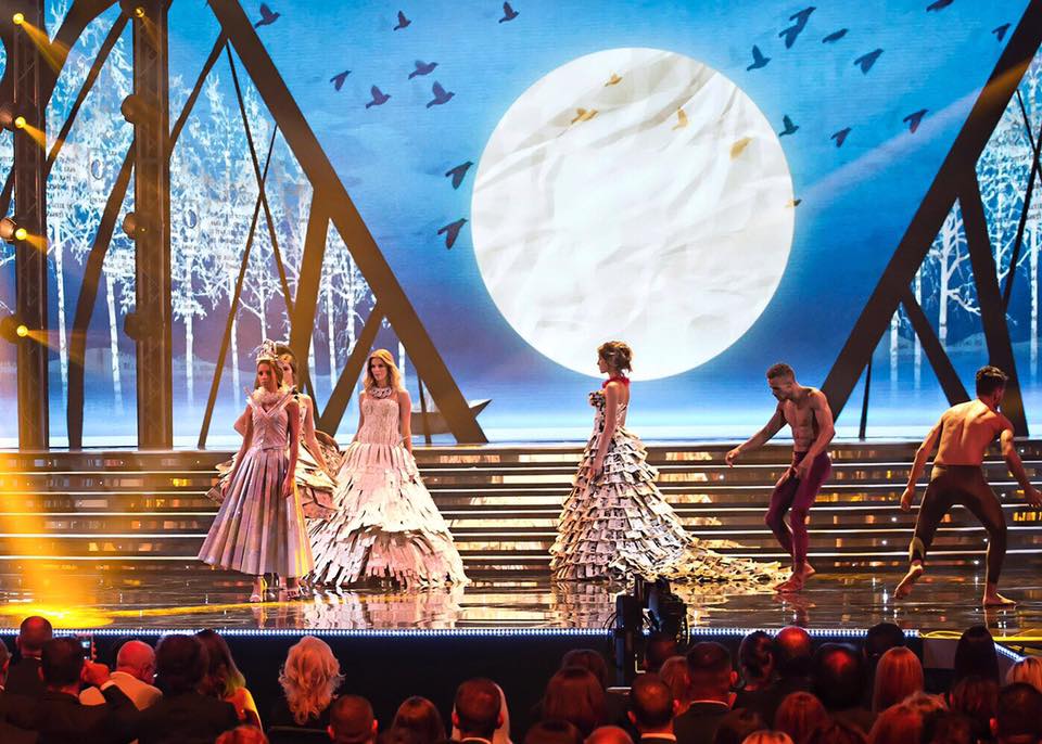 Un vero spettacolo è stata la sfilata delle 5 Miss arrivate in finale indossando degli abiti da red carpet di carta, dei capolavori all’insegna del riciclo.