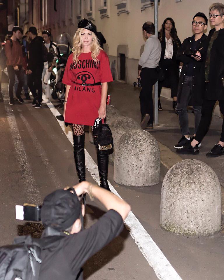 I look scelti sono stati pensati in relazione gli impegni che avevo. Alla sfilata di Les Copains un outfit decisamente chic, di un colore chiaro (la sfilata era alle 13.00), e per il fashion show di Moschino, un vero spettacolo, ovviamente un abito di Moschino! Al party di Marie Claire un abito lungo in pizzo, e per le strade di Milano una mise colorata e una tuta meravigliosamente nera.
