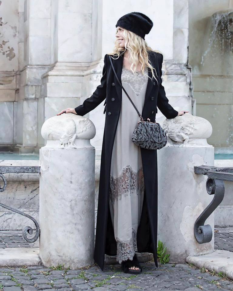Il lungo cappotto, il tessuto morbido del vestito …linee flessuose dentro le quali muoversi comodamente, un look romantico, street e H24, perfetto dal mattino alla sera!