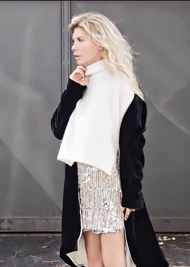 Voilà! Ecco il necessario per un look da tardo pomeriggio in poi! Gli ingredienti fashion ci sono tutti: il pull bianco e la gonna “luccicante” e sopra tutto il cappotto ampio di ATIR’ E Roma