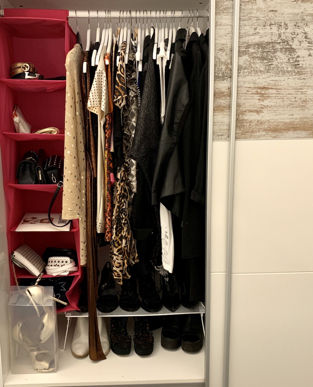 Nel contenitore verticale ho sistemato tutte le borse e le cinte, giuro non sapevo proprio dove metterle, e con il ripiano rigido ho ottenuto due ripiani per le scarpe