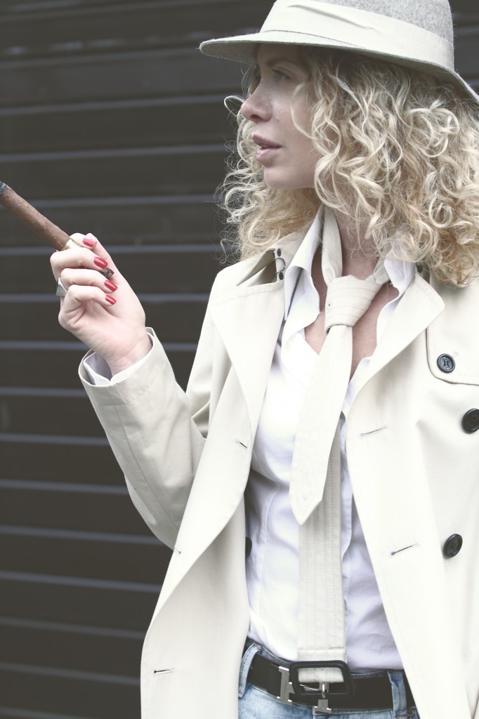 Viste le previsioni del tempo il trench mi sembra l’argomento adatto da trattare in questo weekend. Questa volta l’ho interpretato scherzando un pò e calcando la mano sull’aspetto maschile di questo capo che in realtà è assolutamente unisex. Togliendo i tacchi, la cravatta/cinta e mettendo un paio di calosce con i  jeans e un bel cappello trovo che sia un outfit comodo e raffinato. foto by Francesco Massella       Cappello
